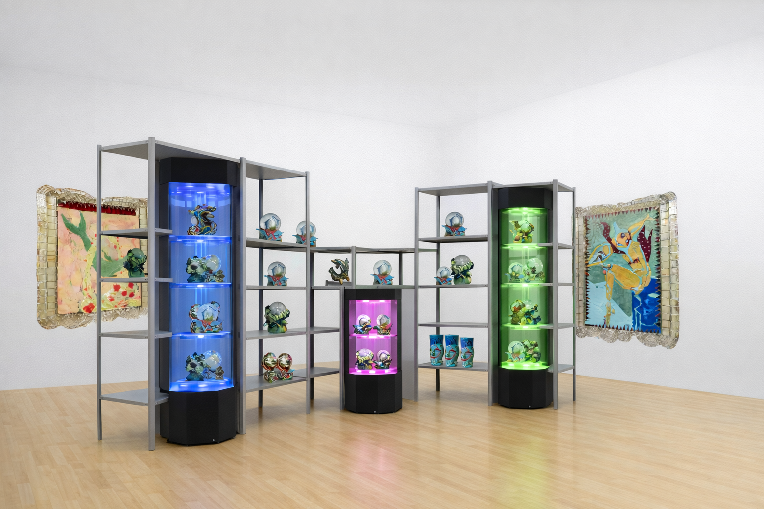 Metal shelving, metal rotaing display cases, cast glass panels, bio-wax tchotchkeys, LED, and paintings
