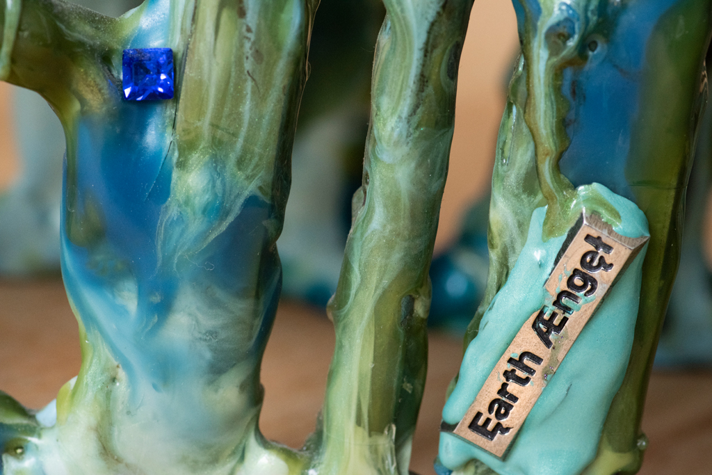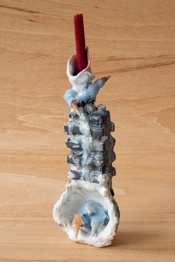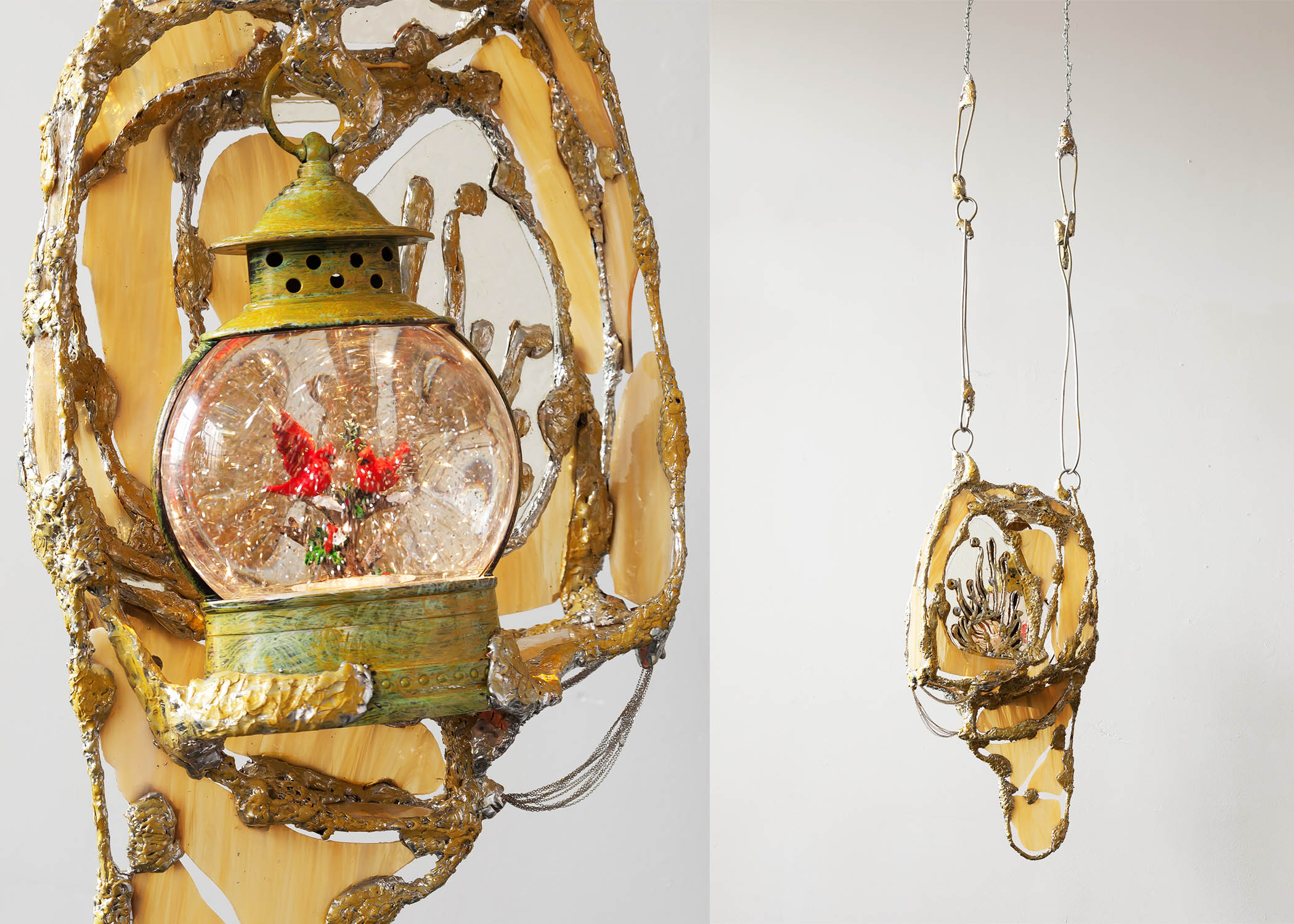 Blown glass, metal, scented body wax, chain, resin, brass chimes, shells, drift wood, and string.