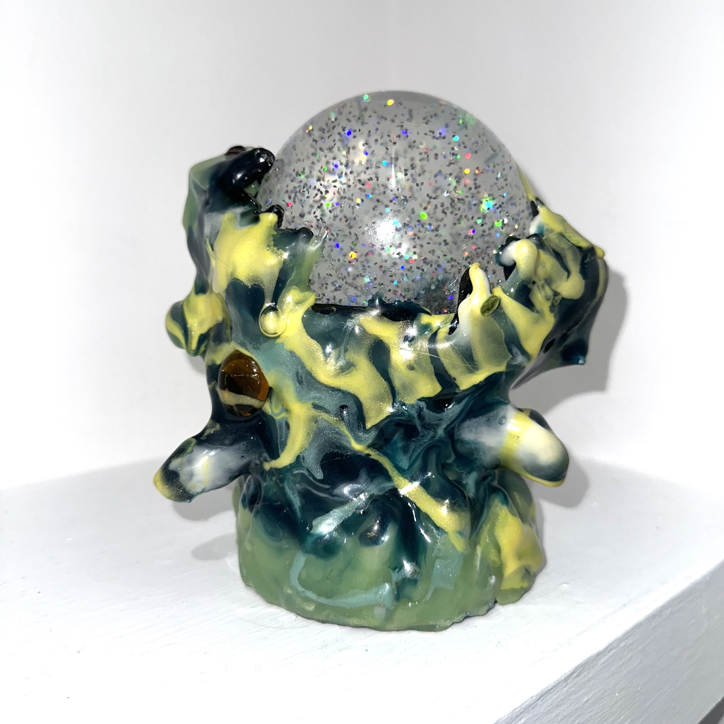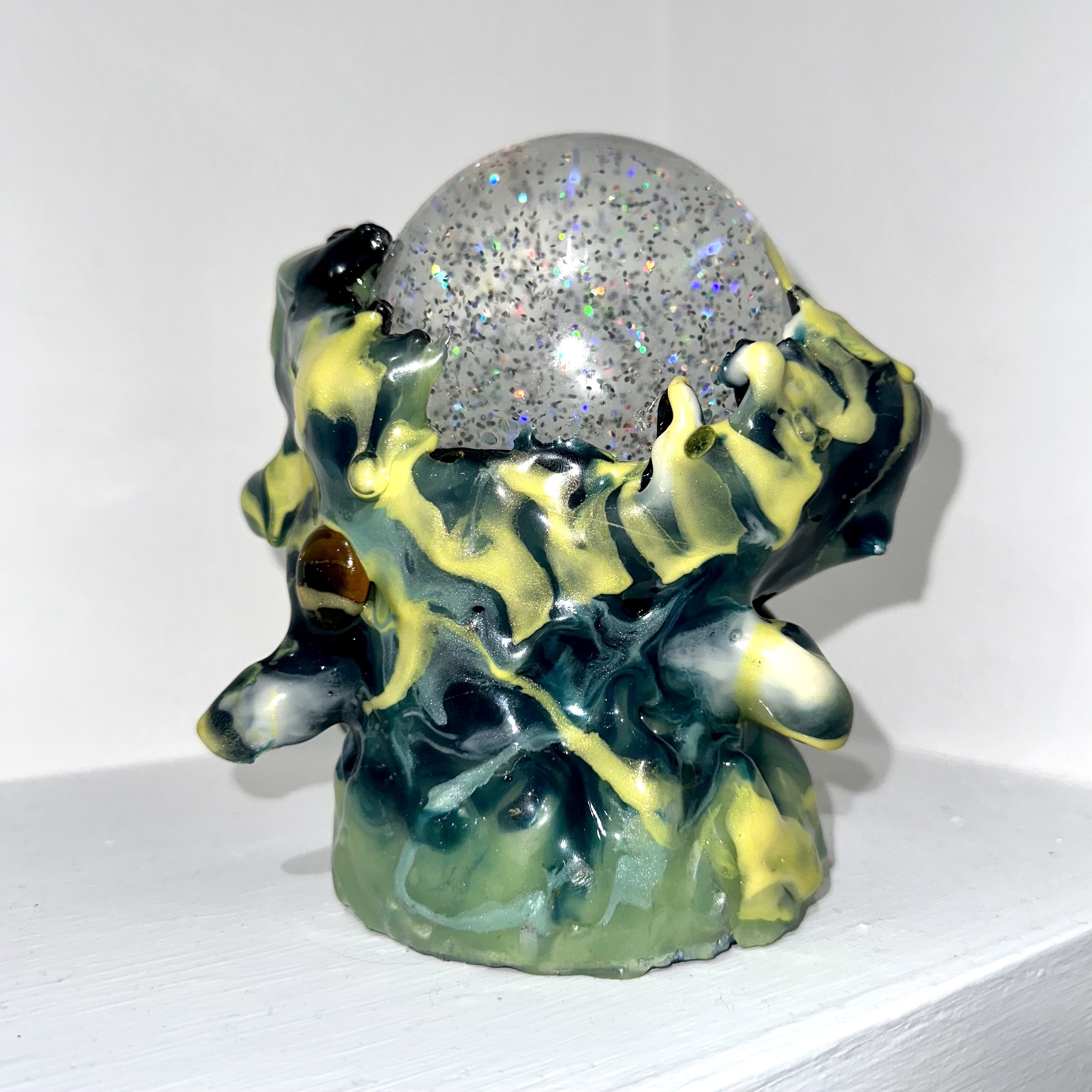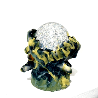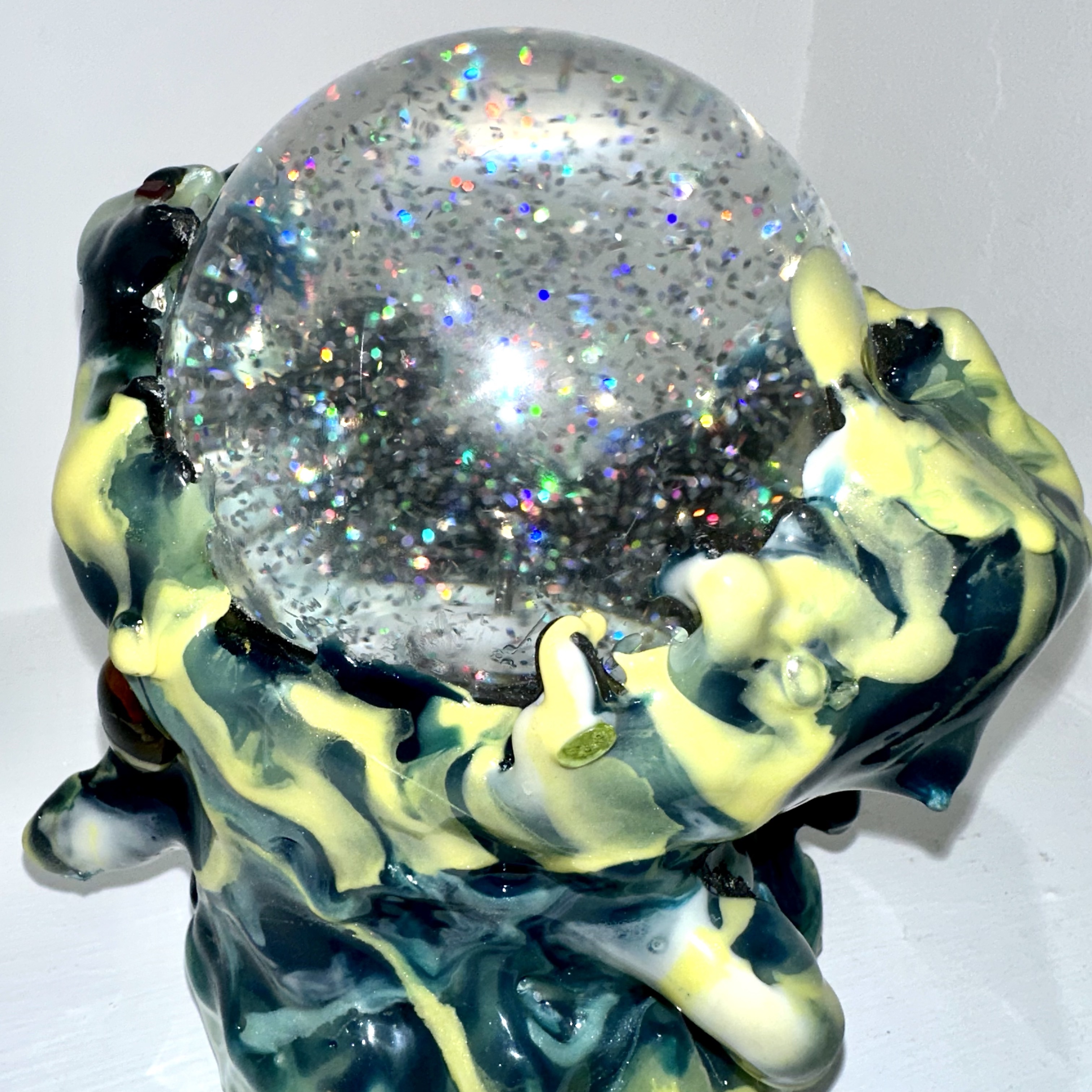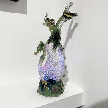 Dragonfruit pt.2, 2024 LED Snow Globe seahorse, with Rosin-based Bioplatic wax, with gems, stones, pearls, vintage butterfly wings, solder, and shells.