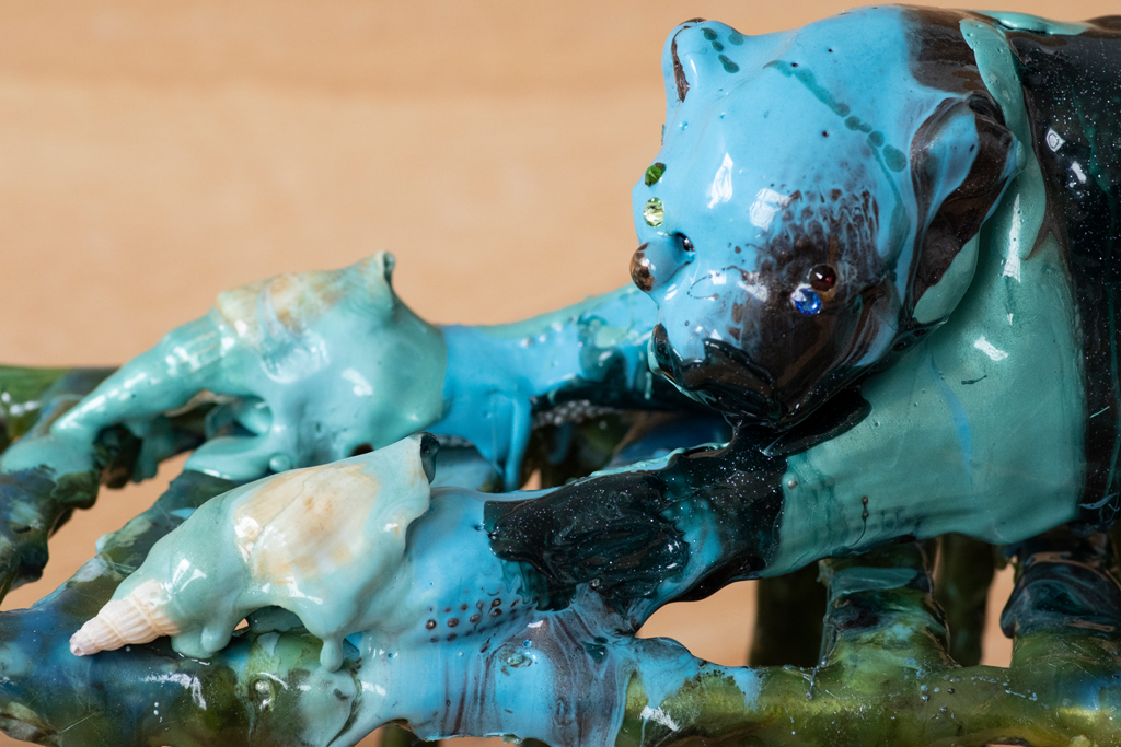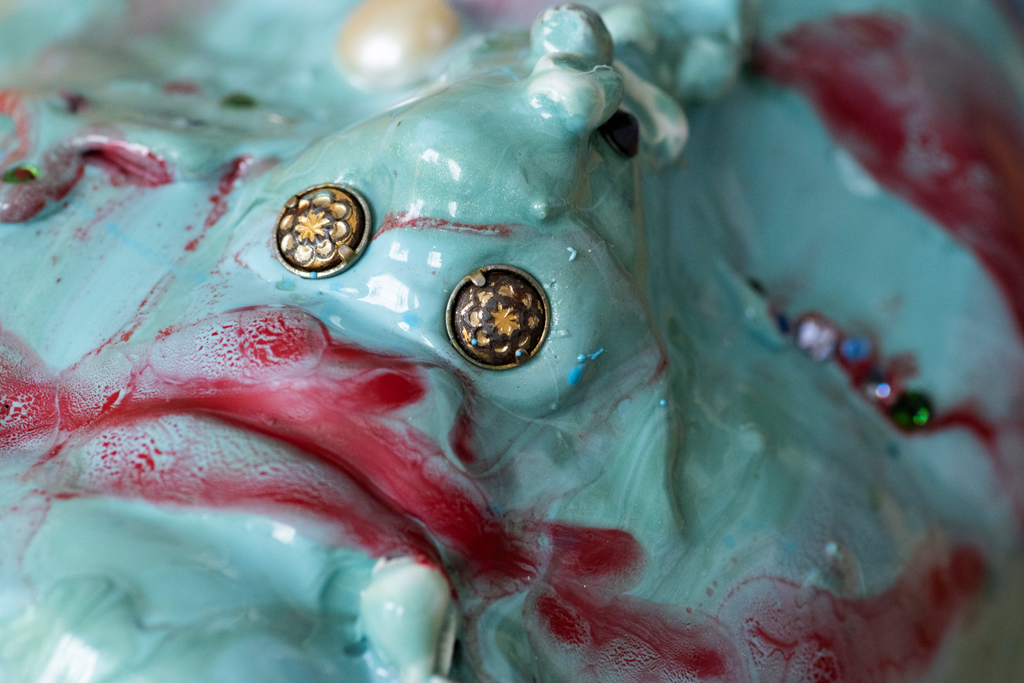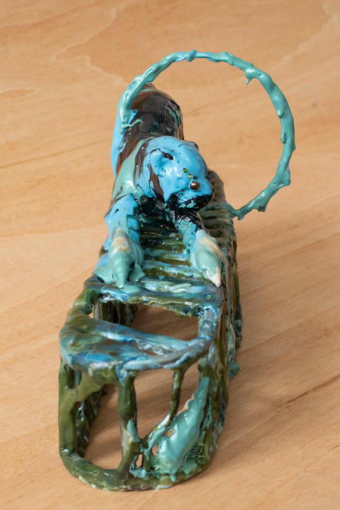 Steel frame, patina, body wax, mica, press on nails, and wood