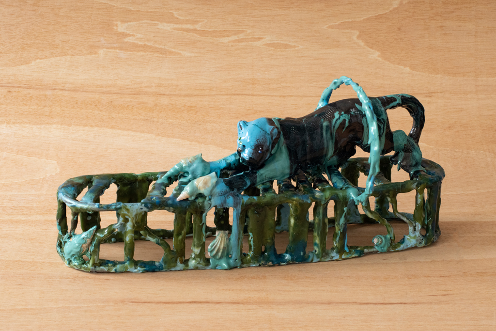 Stained Glass streaky, Obsidian Volcanic Glass – a gift from a friend from Rapa Nui, solder, patina, wire, phosphorescent aggregate, rosin-based bioplastic (body wax) with mica and perfume, jewelry chain with wooden swing, and ceramic black cat.LED Snow Globe Dragon, with Rosin-based Bioplatic wax, with glass gems + stones.
