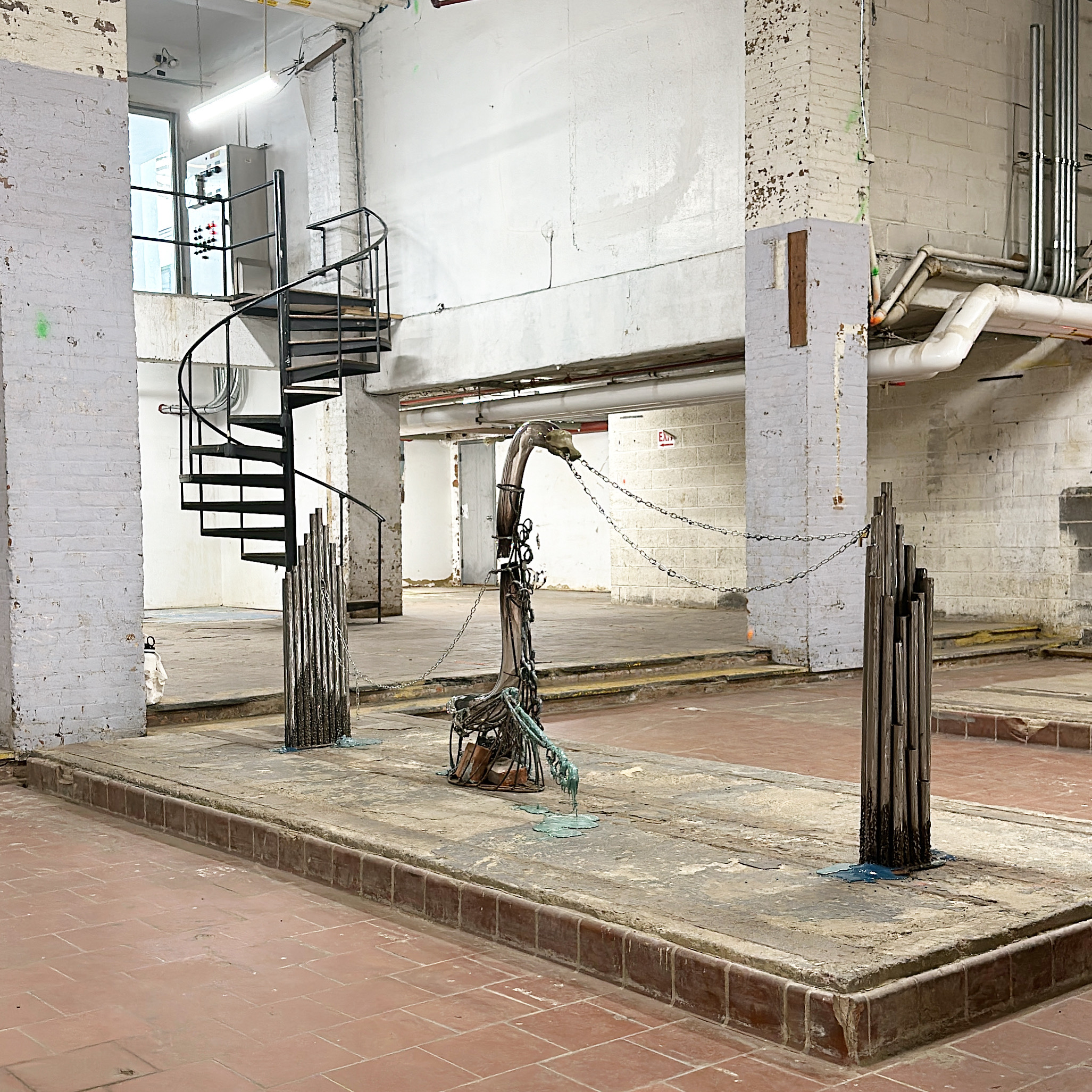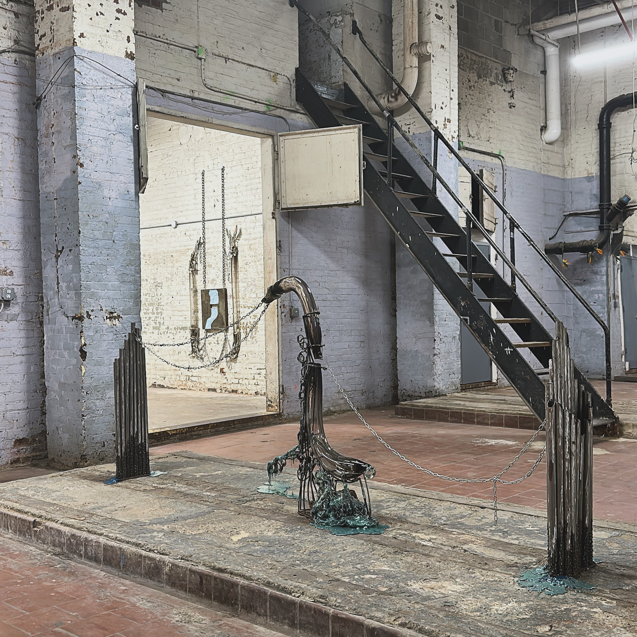 Blown glass, steel, chain, crystal locks, bio-wax, mica, perfume, and bricks