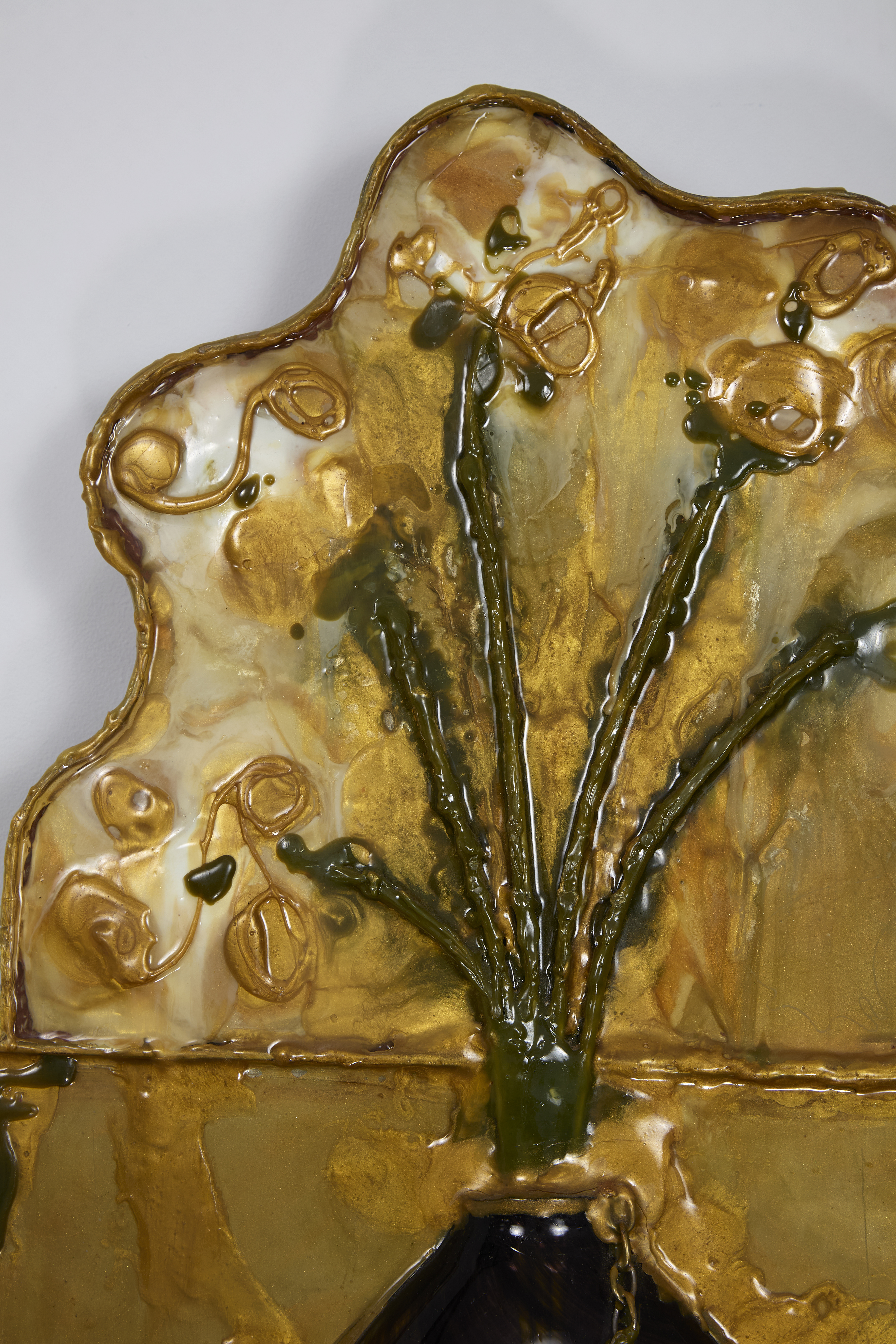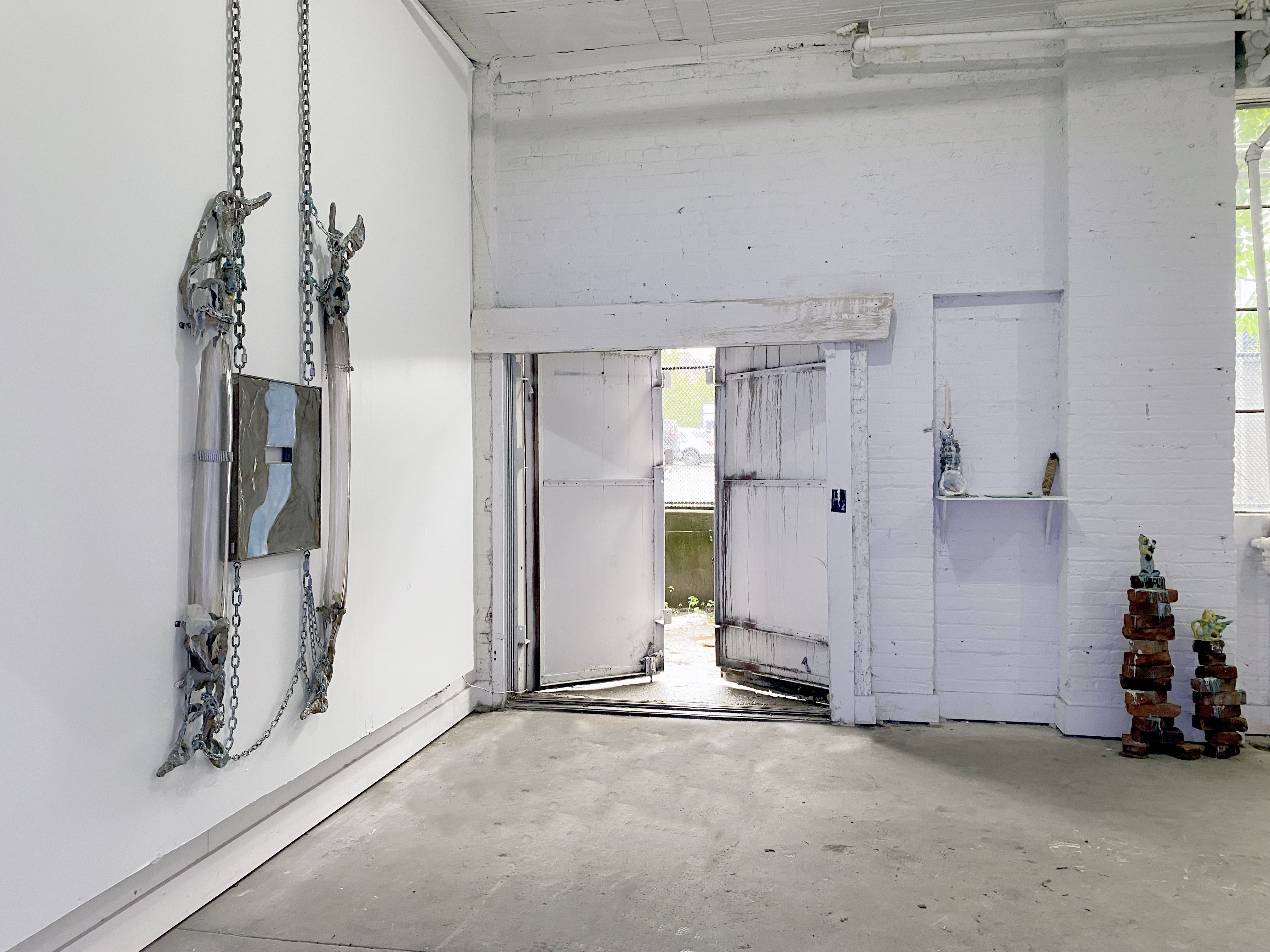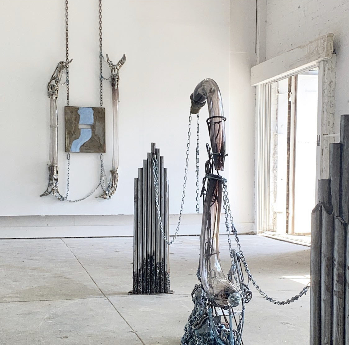 Blown glass, steel, chain, crystal locks, rosin wax, mica, perfume, and bricks.