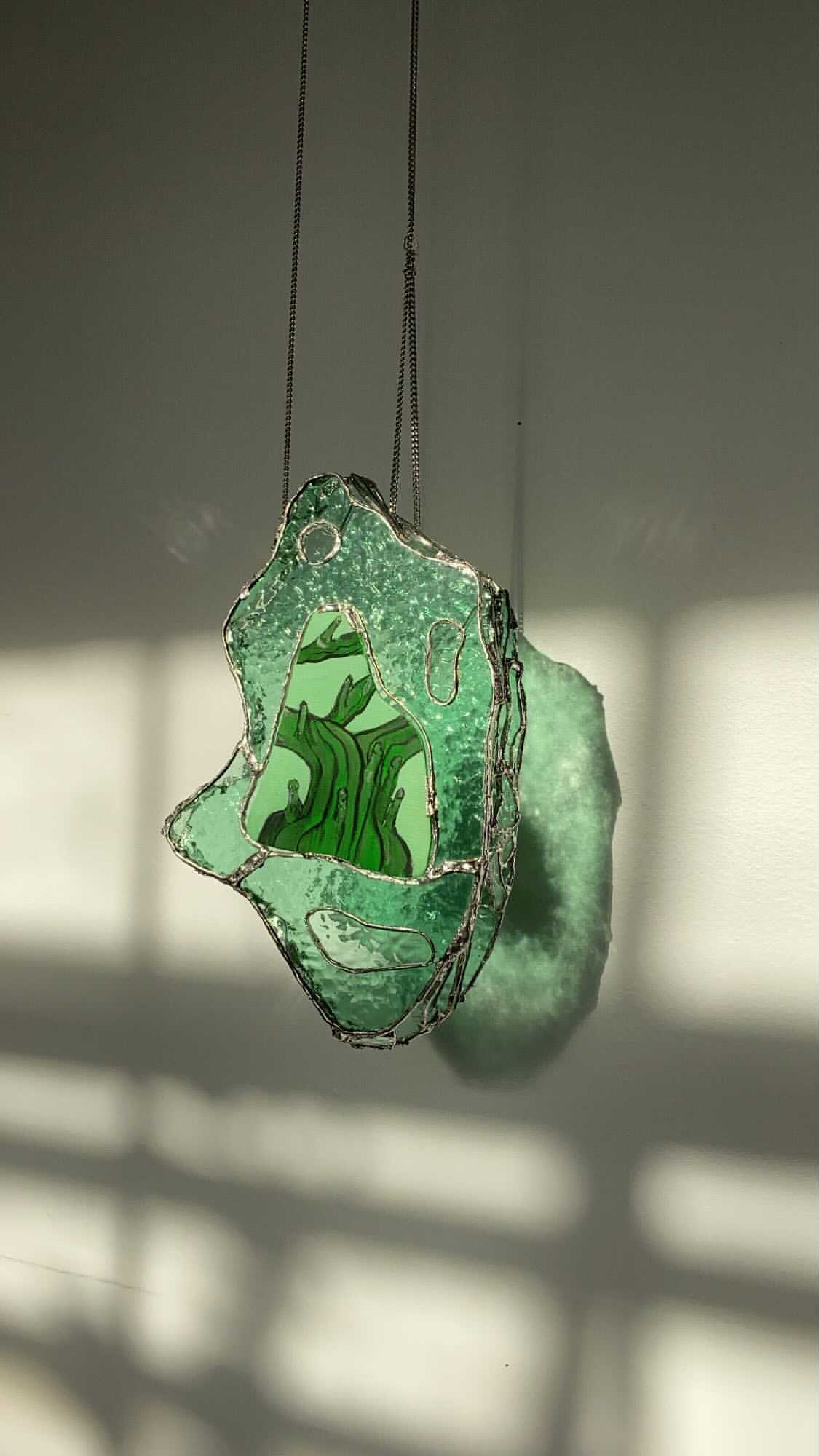 Stained Glass, solder, patina, chain, resin-clay, Dollar Store LED motorized water pineapples, shells, dinosaur bones, fossilized mussles, tigers eye sun, Found objects, glass beads, wood beads, and Bio-wax.