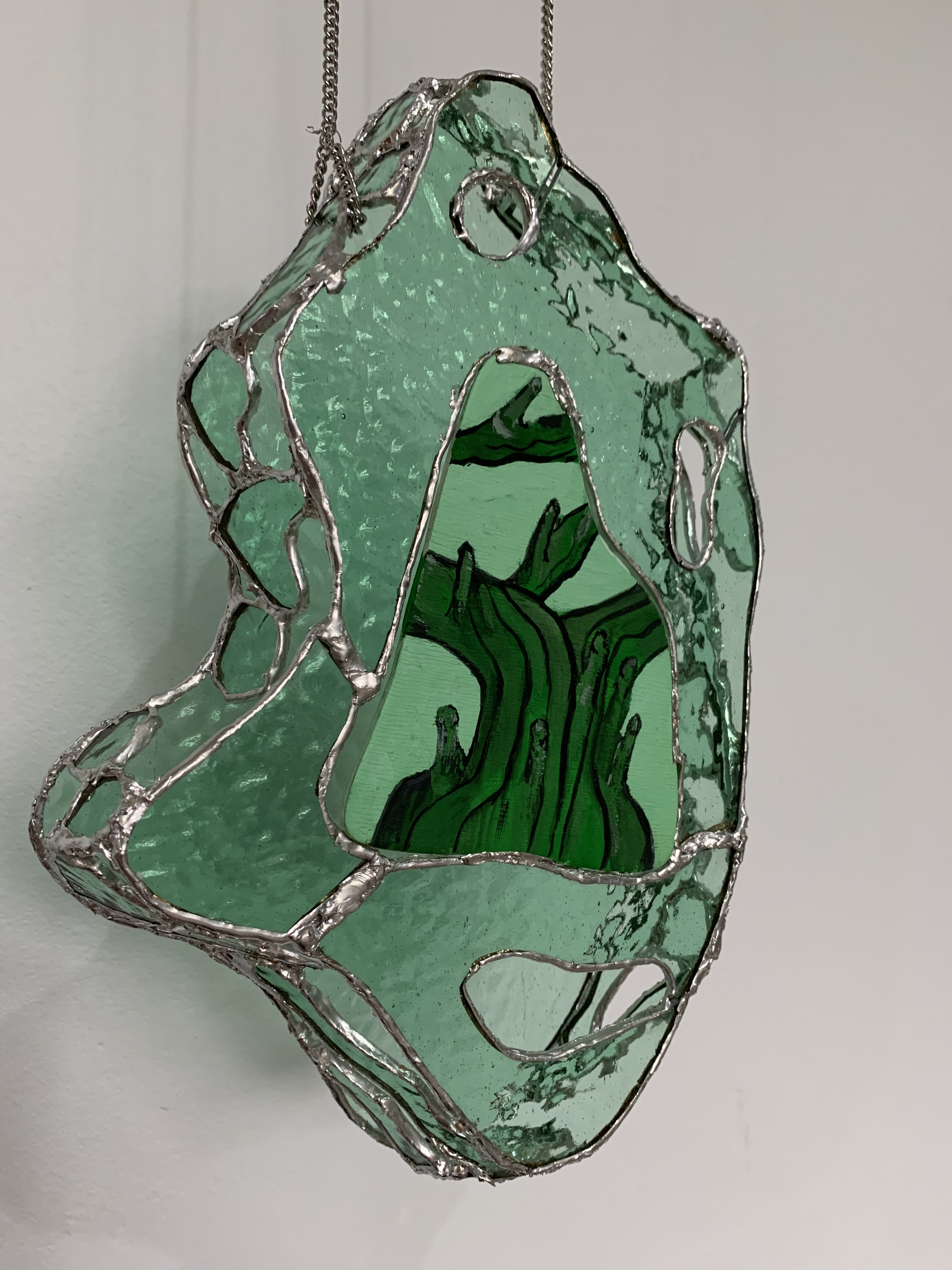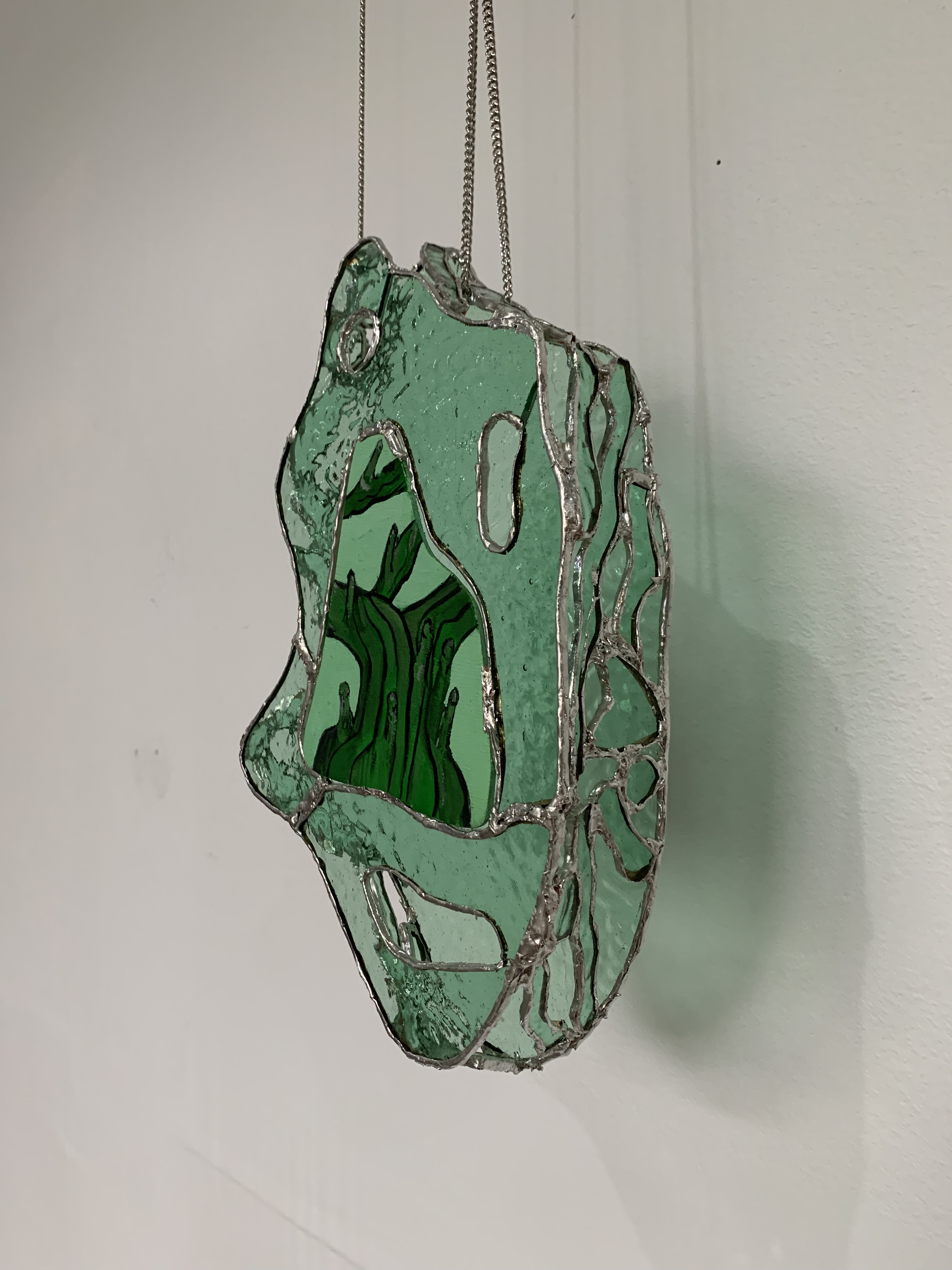 Stained Glass, solder, patina, jewelry chain, resin-clay, LED motorized water pineapples, shells, dinosaur bones, fossilized mussles, tigers eye sun, volcanic egg shaped carved rock, glass beads, wood beads, bio-wax, vintage resin coated butterfly wings.