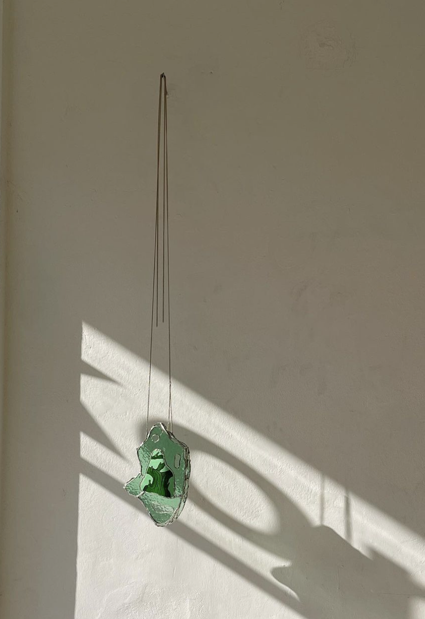 Stained Glass streaky, Obsidian, solder, patina, wire, phosphorescent aggregate, bio-wax, mica, perfume, jewelry chain, wooden swing, ceramic black cats